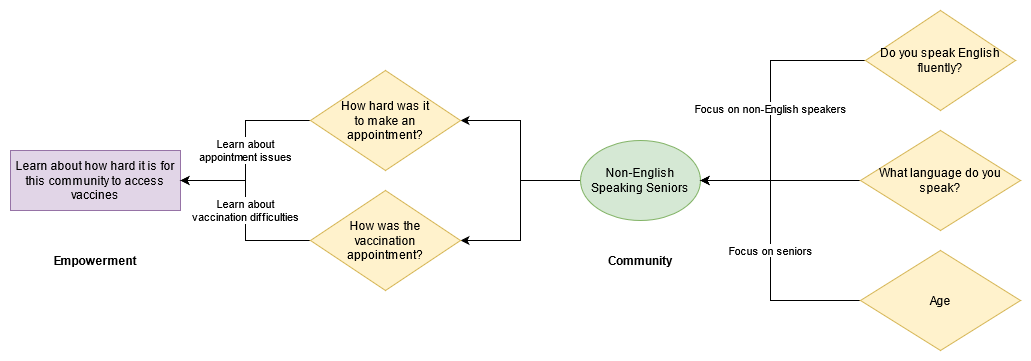 - Represent each question in your survey and draw lines connecting them to either the community representation or the survey/project goal.