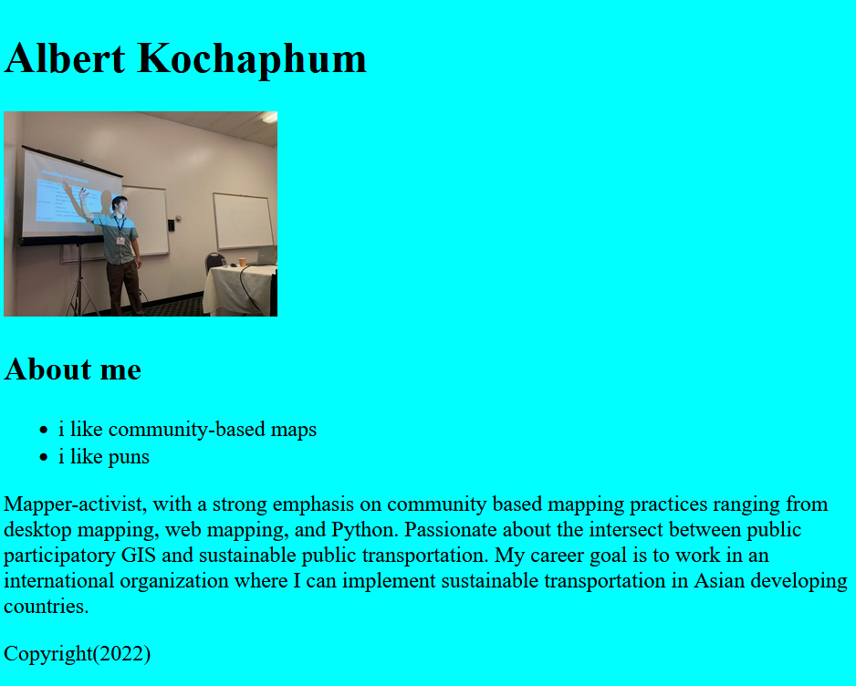 This lab will walk you through the process of creating a static web page in HTML with some additional style elements using CSS. Then you will be tasked to add a map using the Leaflet JS library and host it using GitHub pages.