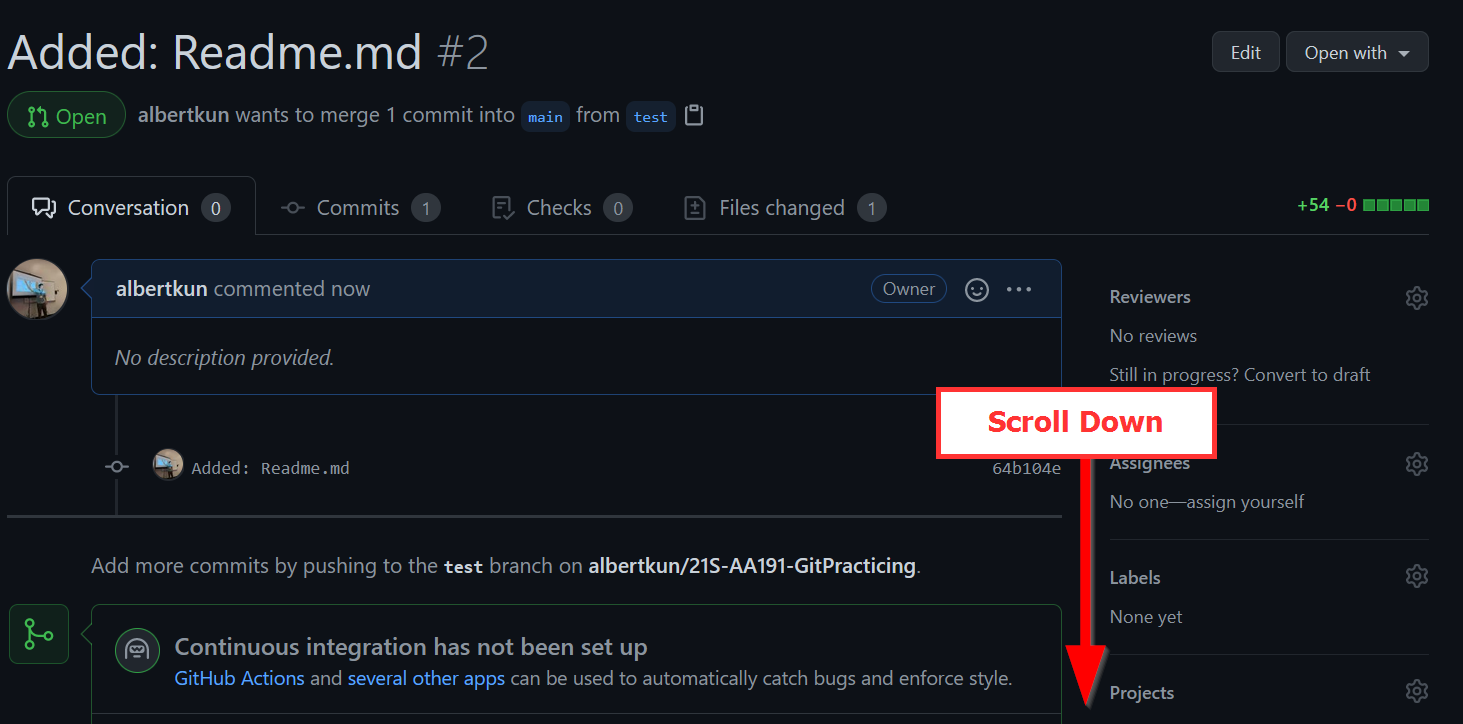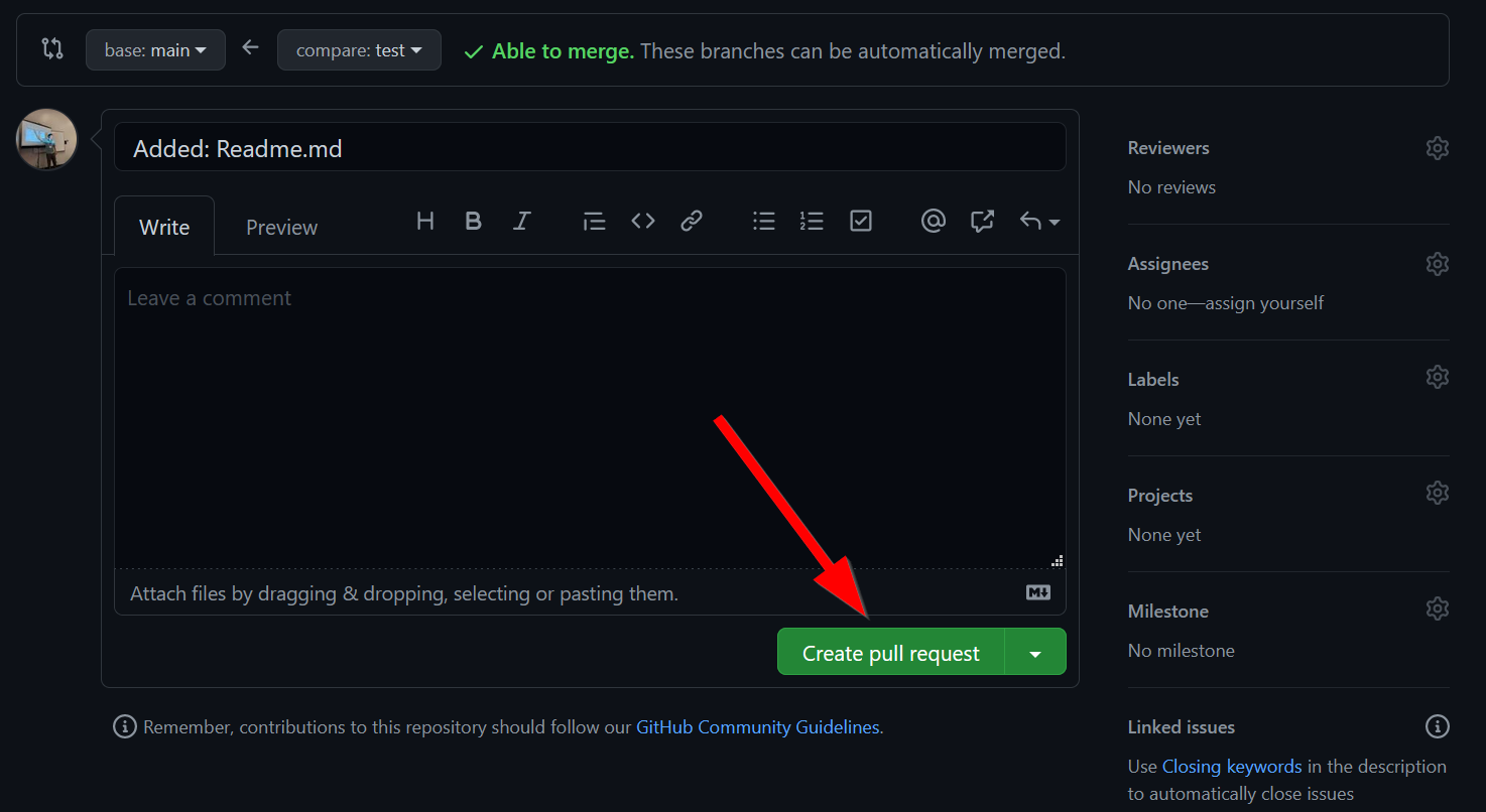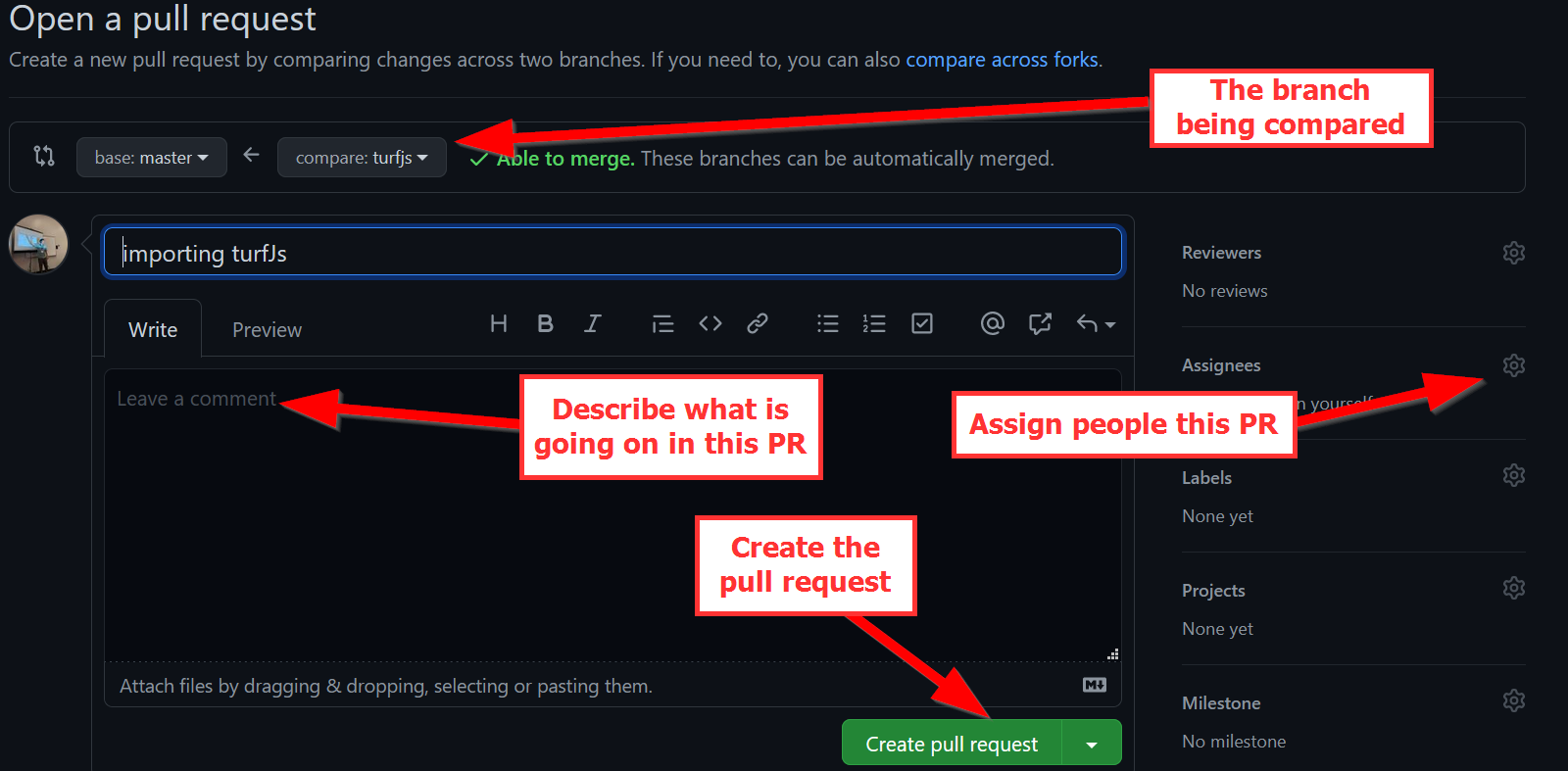 You will then be greeted by a new page where you can title, assign, comment, etc. about the pull request (or PR):