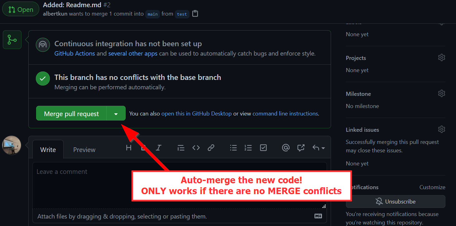 Warning: Merge Conflicts do not allow you to auto-merge a Pull Request!¶